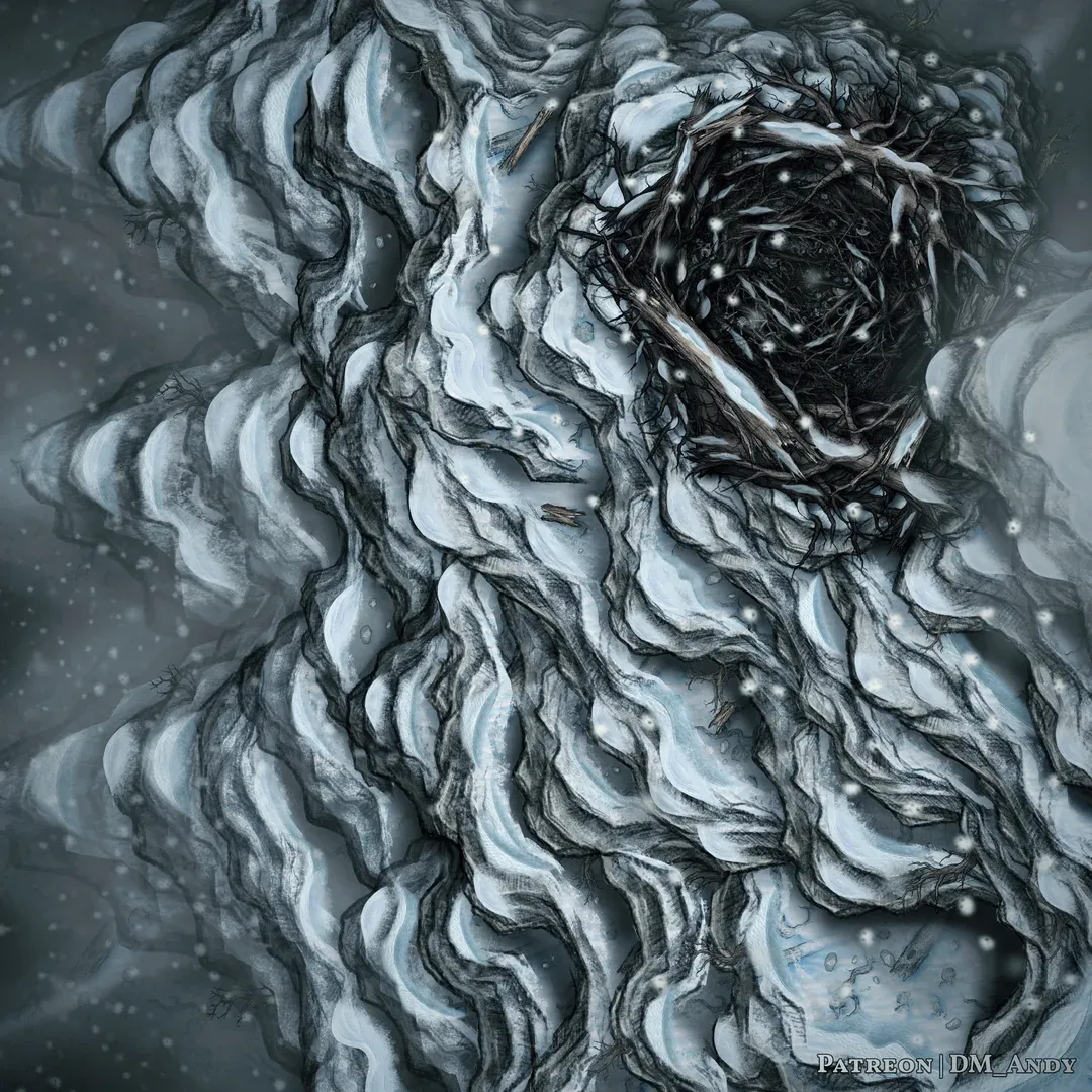 After failing his grapple escape, Rolen was carried 20 feet into the air and dropped into a massive, bowl-shaped nest woven from frozen pines and dragon bones. The mother Roc banked away to hunt the bridge, leaving Rolen with her terrifying offspring.
